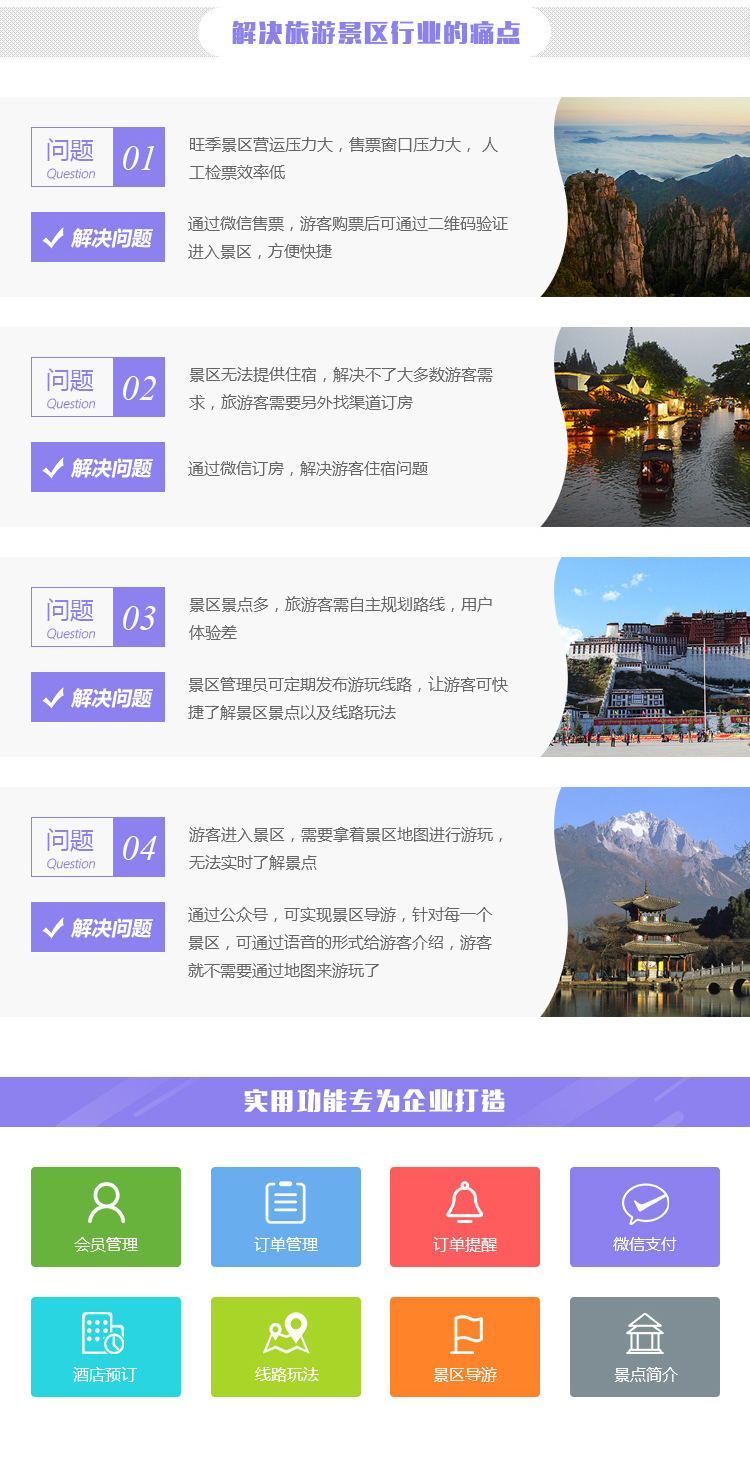 會員管理 訂單管理 訂單提醒 微信支付 酒店預(yù)越 線路玩法 景區(qū)導(dǎo)游 景點介紹