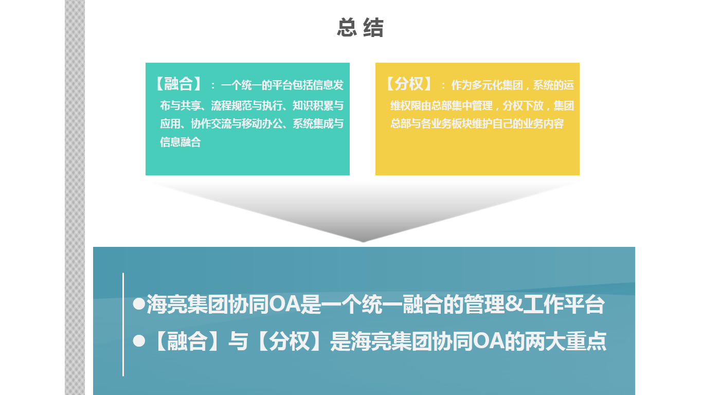 建設內容: 1、項目為海亮構建了公司門戶、職能門戶、專項門戶和工作門戶,承擔集團信息傳達與共享發(fā)布。 2、通過OA管理平臺實現(xiàn)集團流程制度規(guī)范與執(zhí)行,包括集團管理流程、下屬公司管理流程和與SAP系統(tǒng)集成的業(yè)務審批流程。流程系統(tǒng)在縱向實現(xiàn)集團總部對下屬公司的規(guī)范管理和服務支撐,在橫向實現(xiàn)集團總部和下屬公司的跨部門事務審核處理。流程應用集團、農業(yè)、環(huán)保、股份四大板塊共計19類152條流程。 3、建了企業(yè)統(tǒng)一的知識庫,落實制度匯編,實現(xiàn)集團知識文檔的積累與應用。 4、OA與SAP系統(tǒng)的集成包括人員組織同步、流程審批集成和管理報表集成,充分實現(xiàn)集團系統(tǒng)集成與信息融合。 5、系統(tǒng)構建立體、全面的溝通渠道,包括即時通訊、通訊錄、短信通知、協(xié)作區(qū)、移動辦公等多渠道建立集團溝通與移動工作平臺。