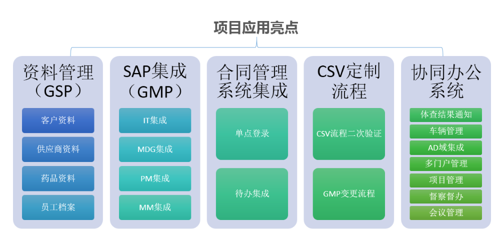 本次項(xiàng)目建設(shè)亮點(diǎn)主要有:資料管理(GSP)、SAP集成(GMP)、合同管理系統(tǒng)集成、CSV定制流程,協(xié)同辦公系統(tǒng)。